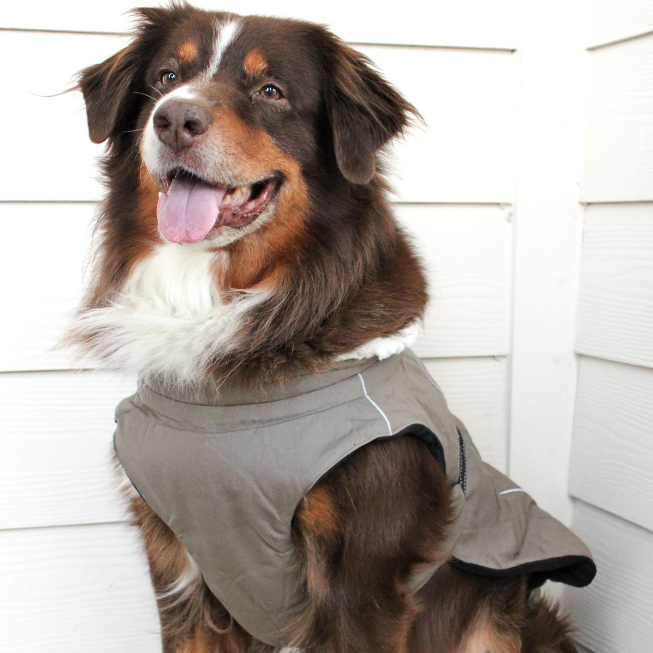 Get ready for the great outdoors! The Alpine Tuf Terrain dog coat is made with a tough cotton canvas outer layer while still keeping the cozy fleece lining and soft sherpa-lined collar of our other Alpine coats. Straps are adjustable with reflective safety trim. Coat offers covered D-ring access hole and is available in sizes XS through 5XL. The cotton canvas fabric is durable and water resistant - excellent for hiking, herding, or trekking through the urban jungle.